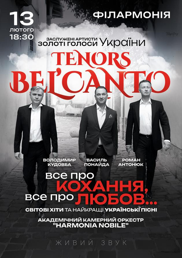 «Tenors Bel’Canto» — колектив, який об’єднали непересічний талант, природний шарм і справжня дружба. Вони щоразу збирають аншлаги. Їхні концерти чекають із нетерпінням. Їх завше вітають гучними оваціями та довго затримують на сцені рясним «Браво! Біс!». В цей вечір прозвучать, знані оперні арії, хіти світової естради та улюблені українські пісні.