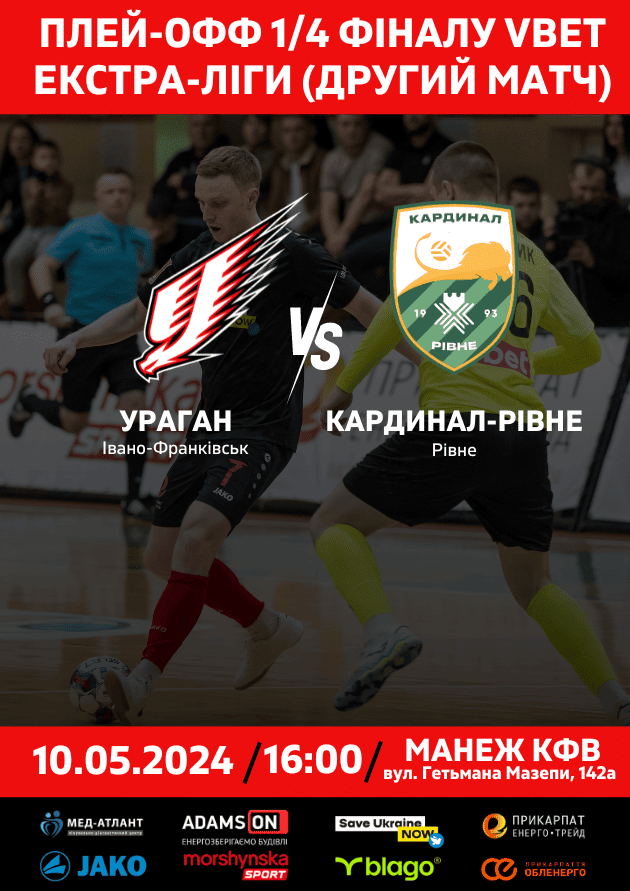10 травня, НФК «Ураган» прийматиме на домашньому майданчику рівненську команду ФК «Кардинал-Рівне» у рамках 1/4 фіналу (другий матч) Vbet Екстра-ліги з футзалу сезону 2023/2024.