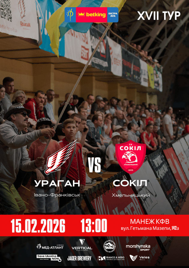 До уваги вболівальників Народного футбольного клубу «Ураган»! У найближчу неділю, 15 лютого, о 13:00, НФК "Ураган" проведе домашній матч в рамках 17-го туру Betking Екстра-ліги. «Дракони» на домашній арені прийматимуть "Сокіл" (м. Хмельницький) Матч відбудеться у манежі Коледжу фізичного виховання (вул. Гетьмана Мазепи, 142). Запрошуємо вас підтримати улюблену команду! Придбайте квитки та приходьте на матч, щоб разом створити справжню атмосферу на трибунах. Важливо: Усі кошти від продажу квитків будуть передані на підтримку військових частин Збройних Сил України, у тому числі місцевих бригад та підрозділів. Чекаємо на вашу підтримку вже цієї неділі!